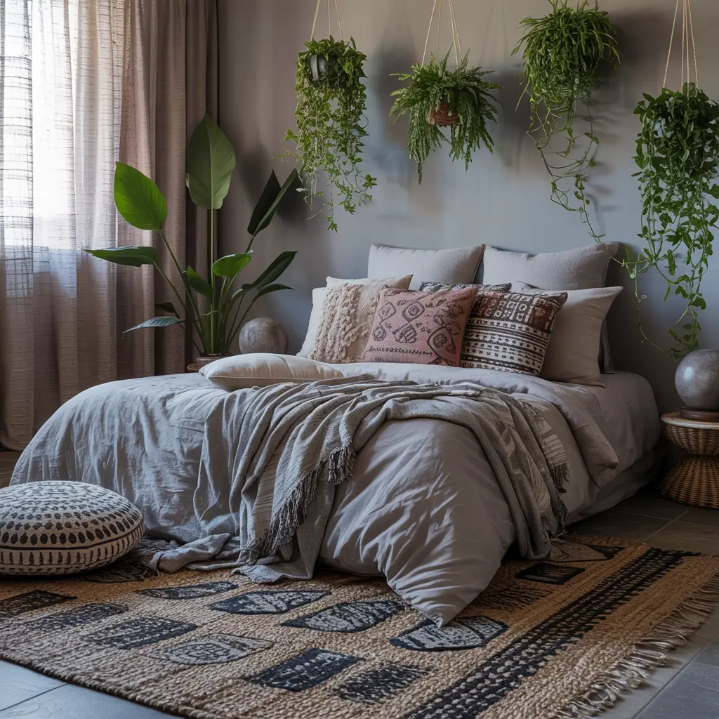 The beauty of grey boho? You can go texture-crazy without the space feeling overwhelming. Grey keeps everything grounded.