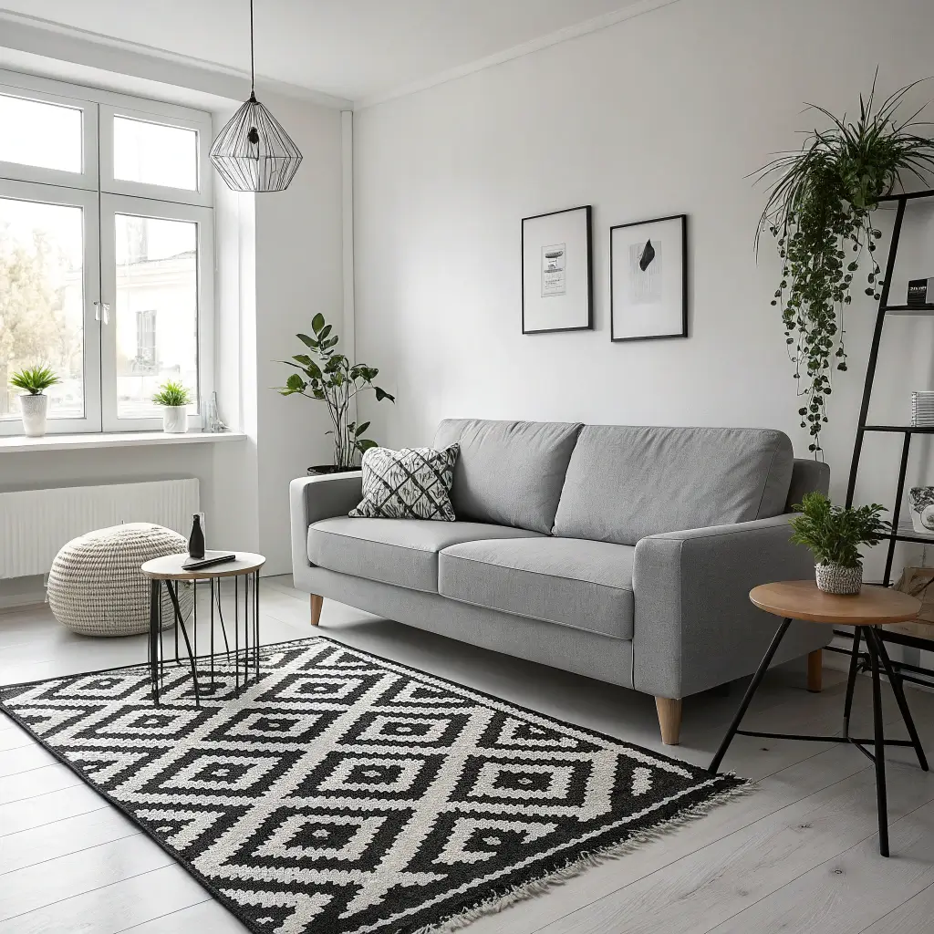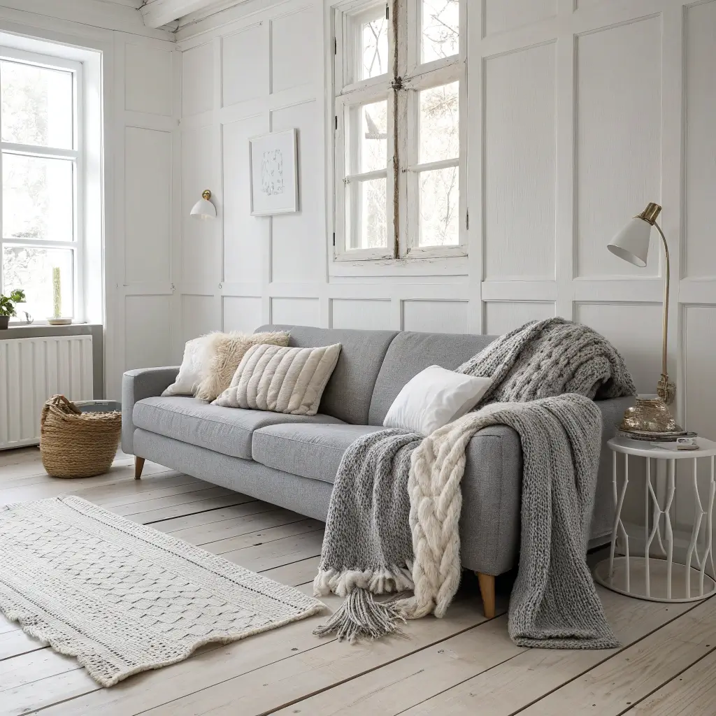 Scandinavian design proves that grey, black, and white can feel genuinely cozy. This approach emphasizes light grey and white as dominant colors, using black sparingly as accent, while layering natural materials throughout.