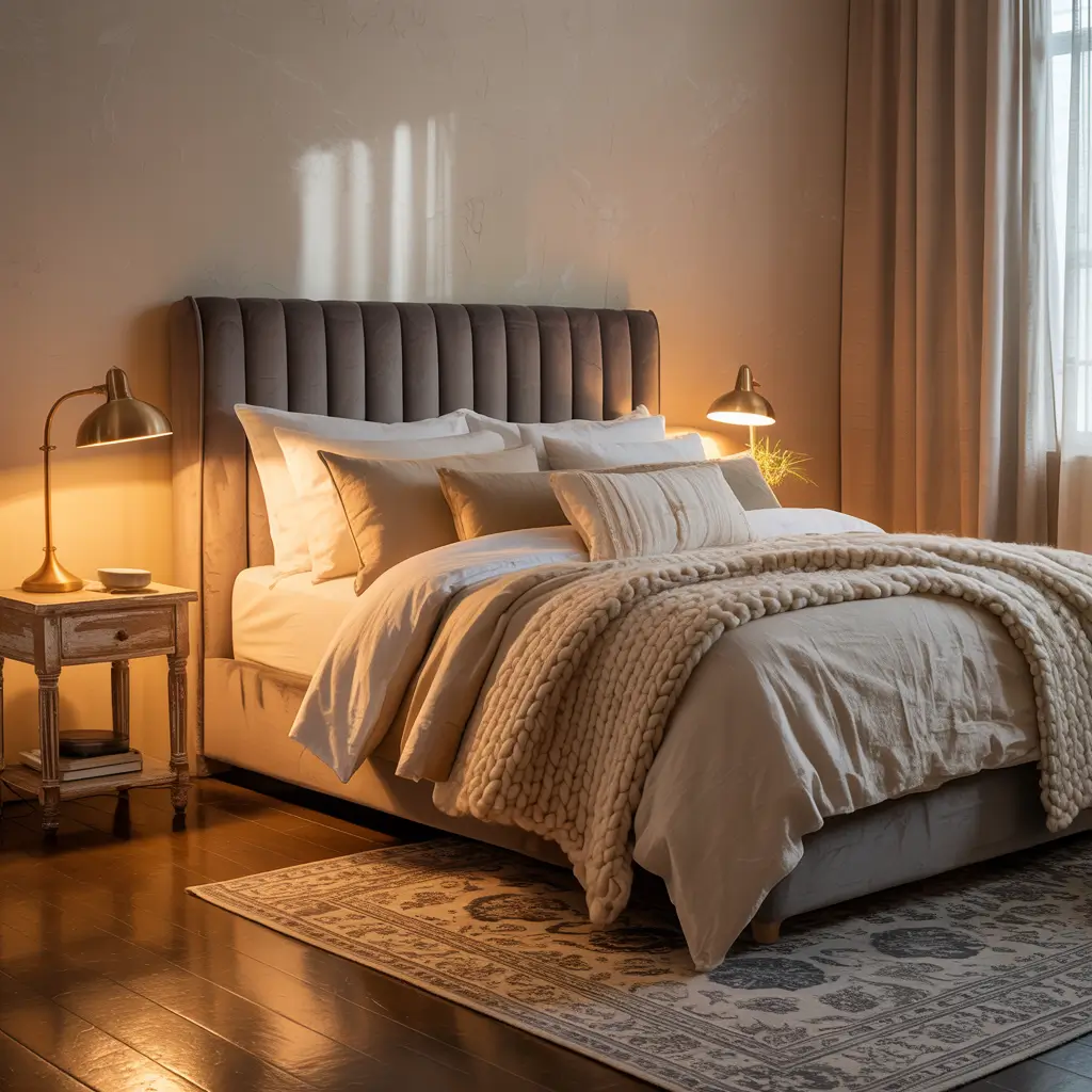 Layer different textures in similar tones to create depth without color chaos. My grey upholstered headboard looks amazing surrounded by cream cable knit pillows, white waffle weave blankets, and oatmeal linen sheets. Each texture catches light differently, creating visual interest.