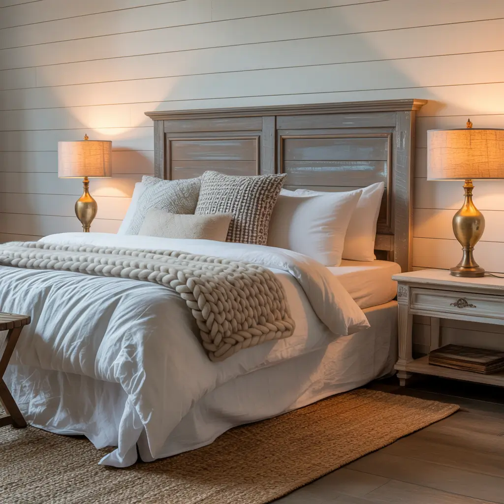 Pair your grey headboard with shiplap walls or wood beam accents for instant farmhouse credibility. My sister nailed this look with her grey upholstered headboard against white shiplap. She added barn door nightstands and suddenly her suburban bedroom looked straight out of Waco.