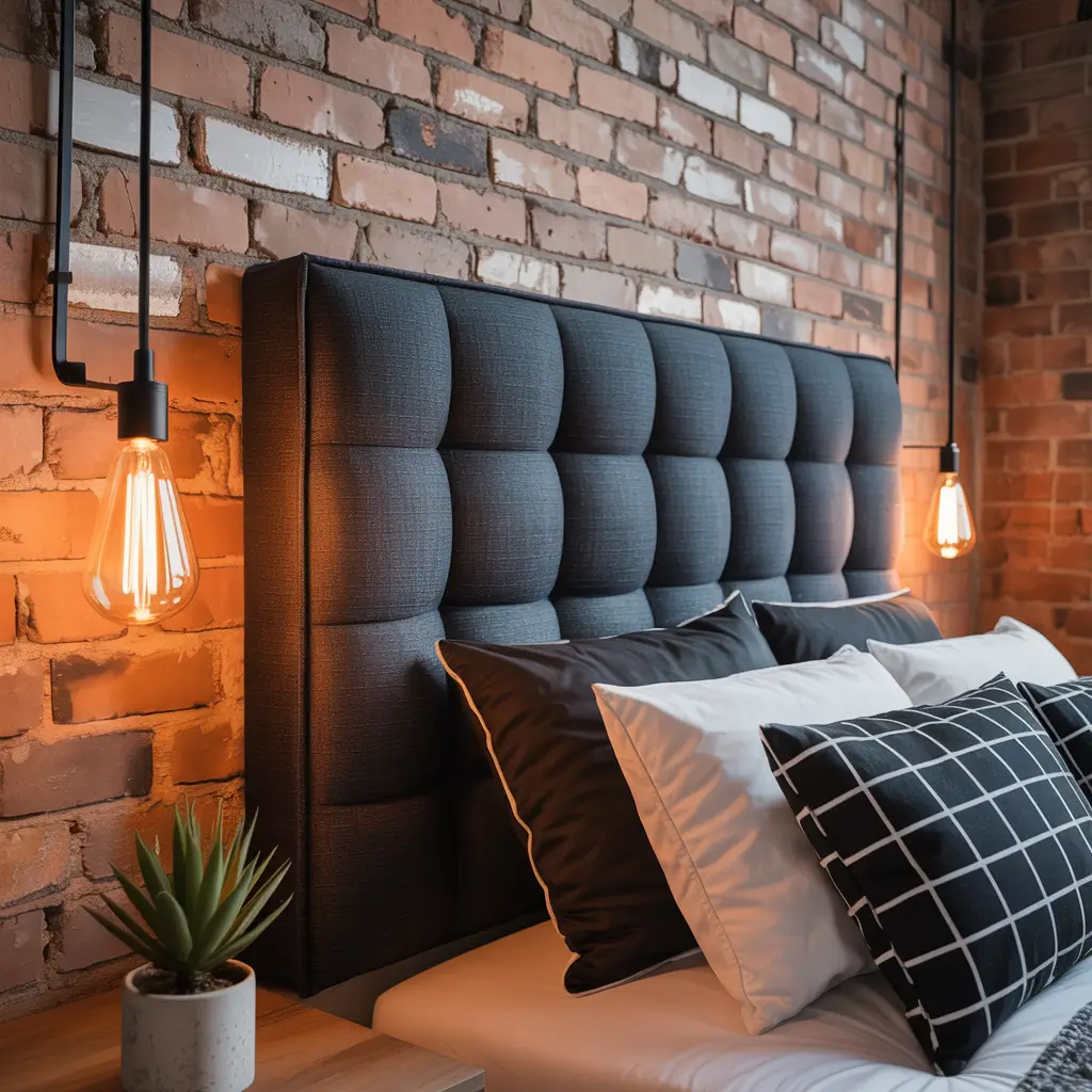Combine your grey headboard with exposed brick, metal fixtures, and raw wood for that converted loft aesthetic. My brother achieved this look in his cookie-cutter apartment using removable brick wallpaper behind his grey headboard. Genius move.