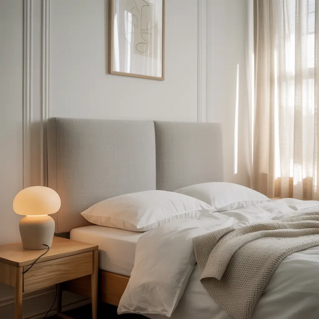 The key lies in restraint and function. Every item serves a purpose. Colors stay neutral. Natural light takes priority. Your grey headboard becomes part of the architecture rather than just furniture.