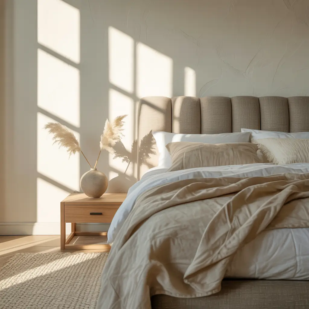 Layer different beige tones through textiles – cream sheets, tan throw pillows, camel-colored blankets. The grey headboard grounds all these warm neutrals, preventing them from floating away into bland territory. Add texture through linen, wool, and cotton to keep things interesting.