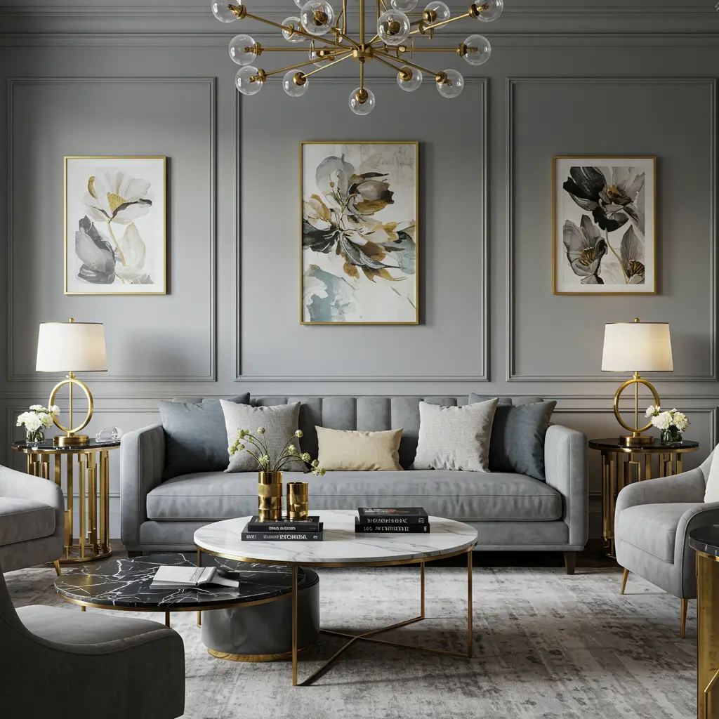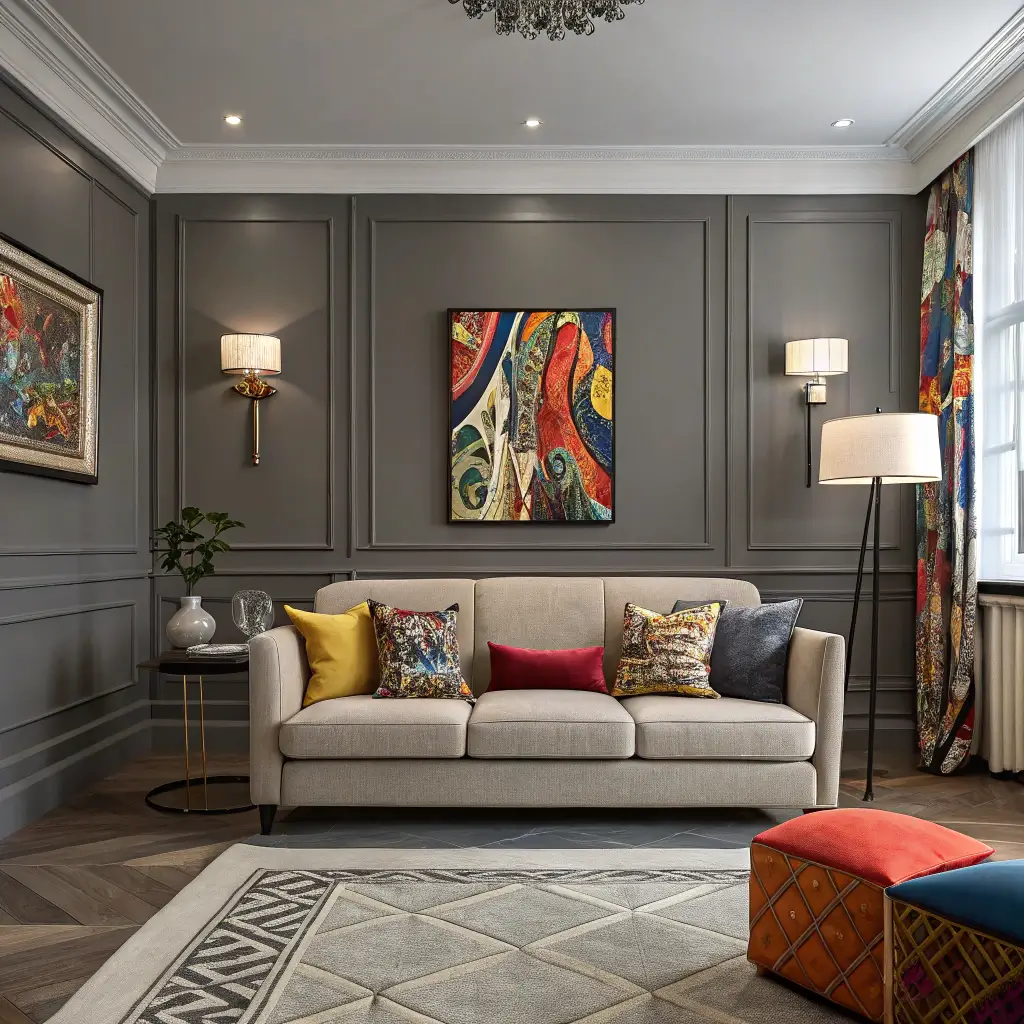 Grey paint creates museum-quality backdrops for artwork display. This approach uses grey walls to highlight art collections, making your living room feel like a curated gallery.
