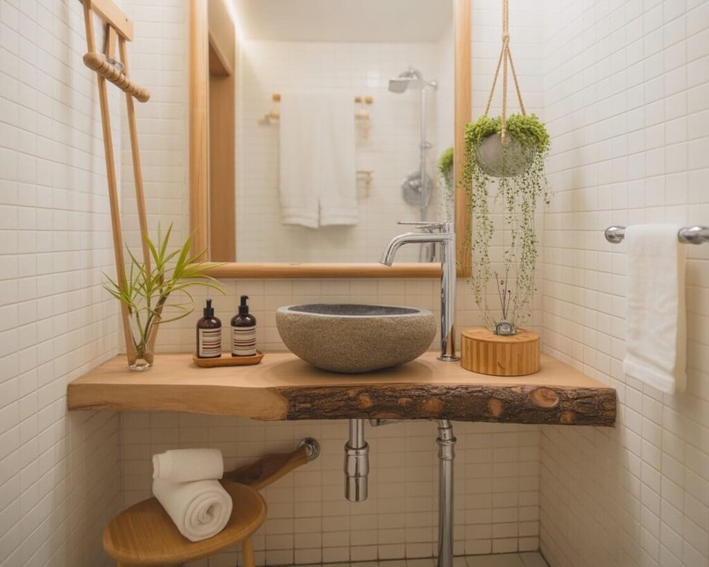 Bringing nature into your half bath might sound weird, but hear me out. Natural elements instantly make any space feel more expensive and calming. We’re talking wood accents, stone textures, and yes, even plants.