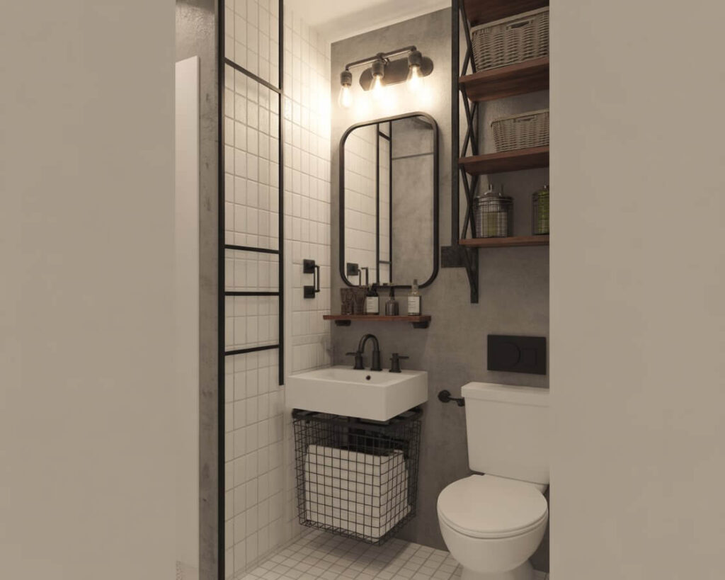 Who says half bathrooms can’t have attitude? Industrial style works brilliantly in small spaces because it embraces simplicity and function. Think exposed pipes, matte black fixtures, concrete sinks, and Edison bulb lighting.