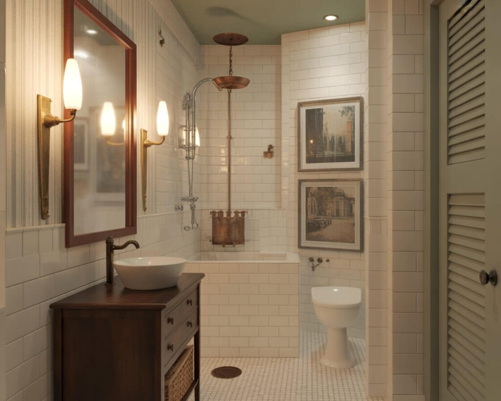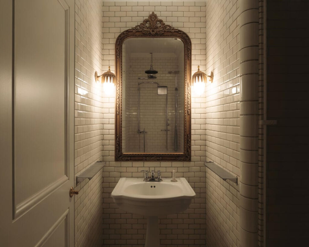 The beauty of vintage style in a half bath? You can mix periods without it looking chaotic. Art Deco mirror with Victorian sconces? Why not! It’s a small space – you can break the rules.