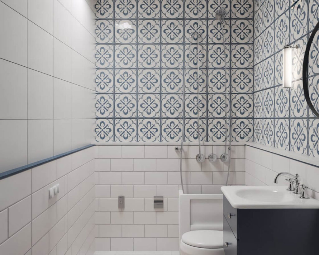 I chickened out on tiling my whole bathroom but did create an accent wall behind the sink with gorgeous blue and white Portuguese tiles. Every guest asks about them, and honestly, they make me happy every time I wash my hands. Sometimes that’s worth the splurge, IMO.
