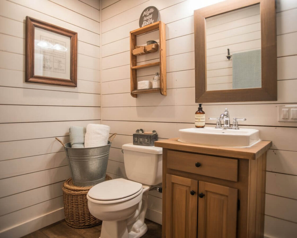 The farmhouse trend isn’t going anywhere, and honestly? Half bathrooms wear it well. The style’s emphasis on simplicity and function makes perfect sense in a small space. Plus, you can DIY most farmhouse elements, which your wallet will appreciate.