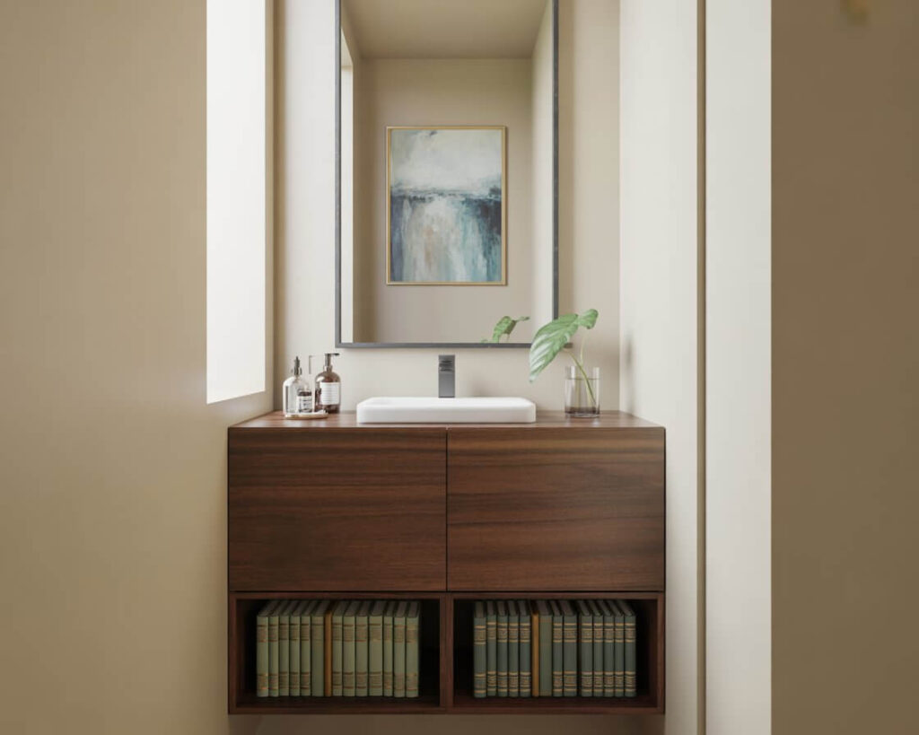 Want to make your half bath feel twice as big? Get that vanity off the floor. Floating vanities create visual space underneath, and suddenly your tiny bathroom doesn’t feel like it’s closing in on you. Plus, cleaning becomes a breeze – no more trying to mop around those annoying vanity legs.