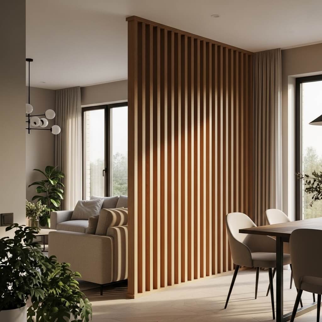 Wooden slats bring warmth and work with almost any decor style. Glass partitions maximize light while maintaining separation. Plant walls improve air quality and add natural beauty. Sliding panels offer ultimate flexibility.