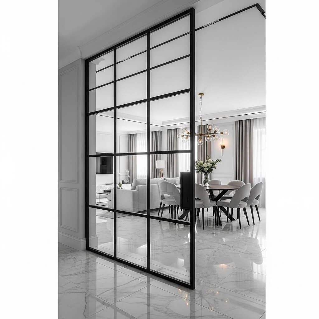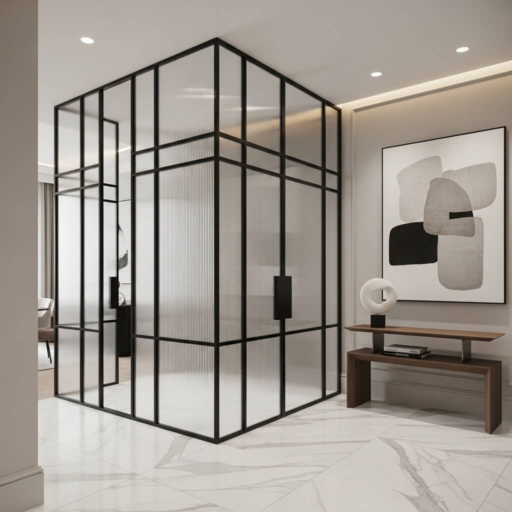Want to add some serious architectural drama to your hallway? Metal frame partitions with frosted glass bring that high-end, custom-built look that makes people think you hired an expensive designer.