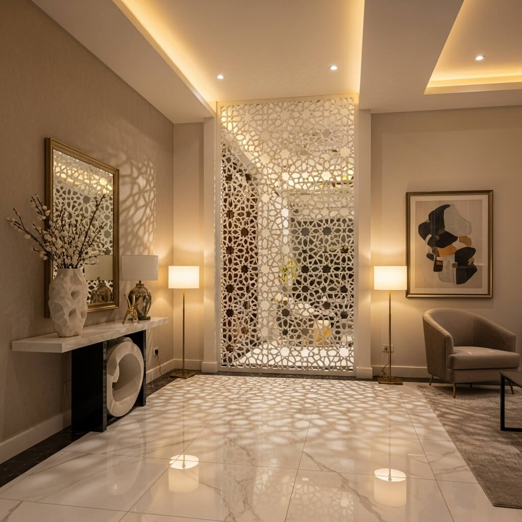 I fell in love with jaali patterns after seeing them used in a luxury hotel lobby. The intricate geometric designs cast the most beautiful shadows while providing visual interest from every angle.