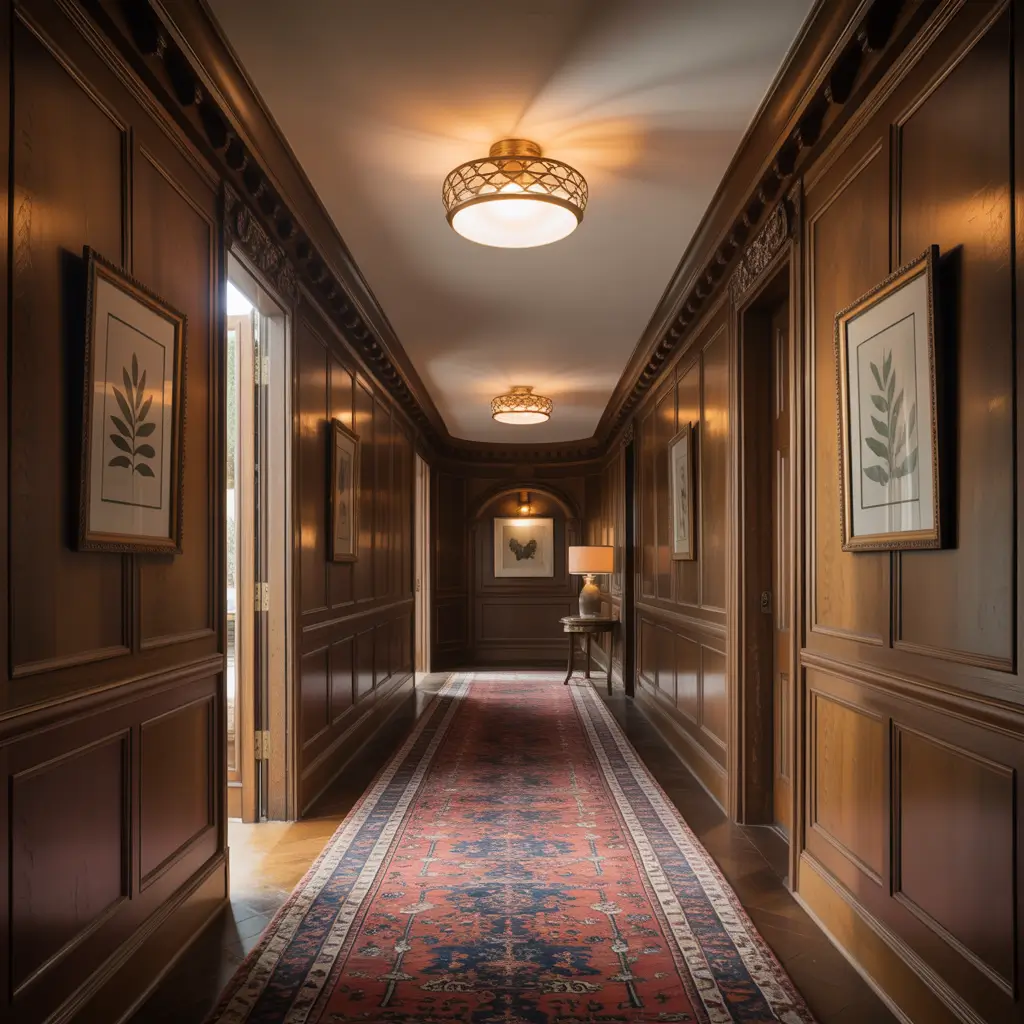 Now, if minimalism makes you yawn, let me introduce you to vintage brass flush mounts. These beauties bring that old-world charm that makes your hallway feel like it belongs in a Victorian novel – minus the creepy ghosts, hopefully.