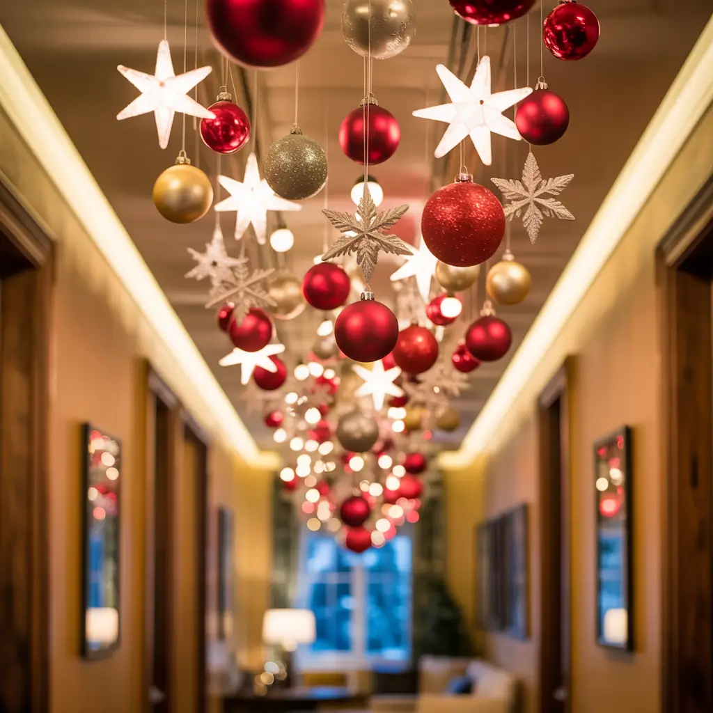 Okay, this one might sound weird, but hear me out. Creating an ornament mobile for your hallway adds movement and sparkle that static decorations just can’t match. Think of it as a sophisticated version of those spinning things you hung over baby cribs.