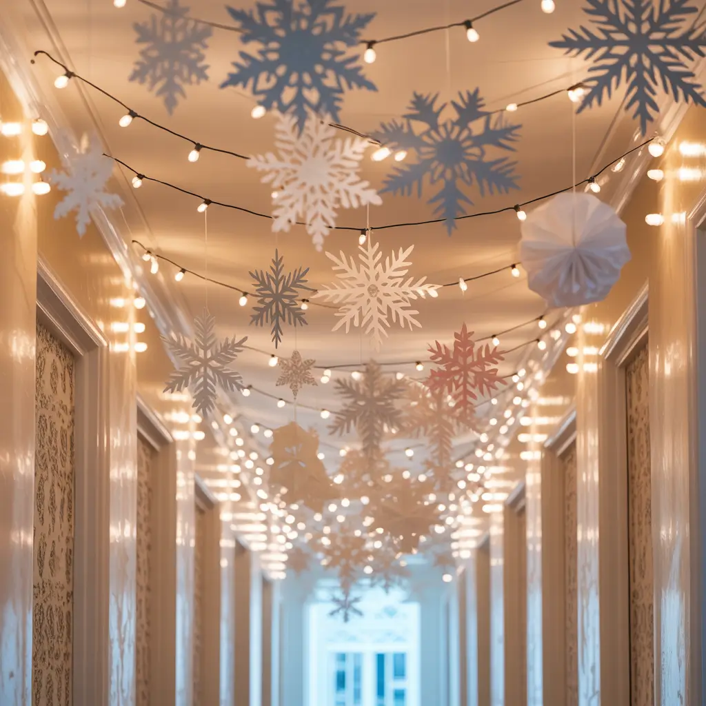 Remember making paper snowflakes in elementary school? Time to channel that energy! Creating a snowflake tunnel effect in your hallway costs almost nothing but delivers maximum wow factor.