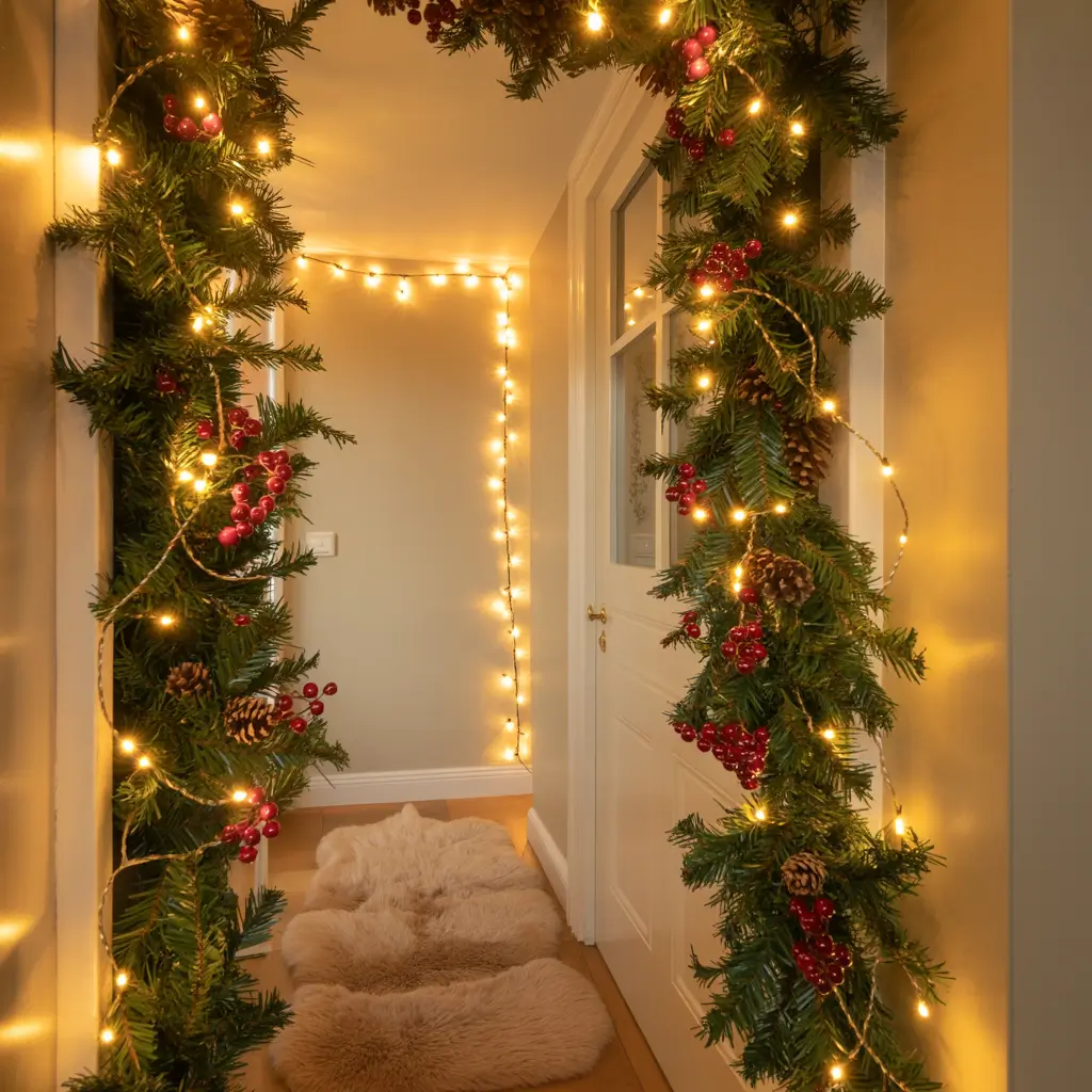 Let’s kick things off with something that screams “welcome to my winter wonderland” the moment someone steps through your door. Twinkling garland lights wrapped around your entryway create this incredible first impression that sets the tone for your entire home.