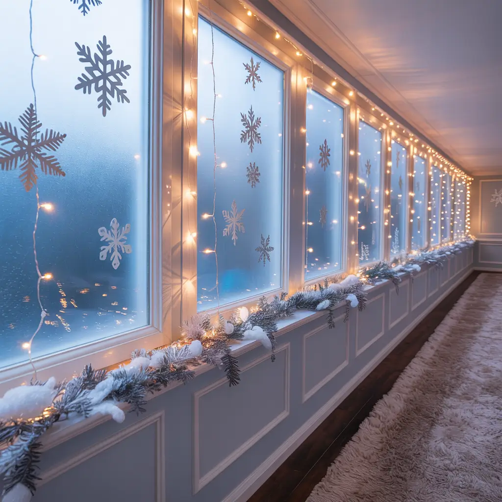 Here’s what I do: I use curtain-style string lights and pair them with frosted window clings or spray. The combination creates this ethereal, dreamy effect that makes your hallway feel like it’s glowing from within.