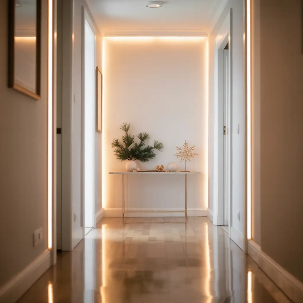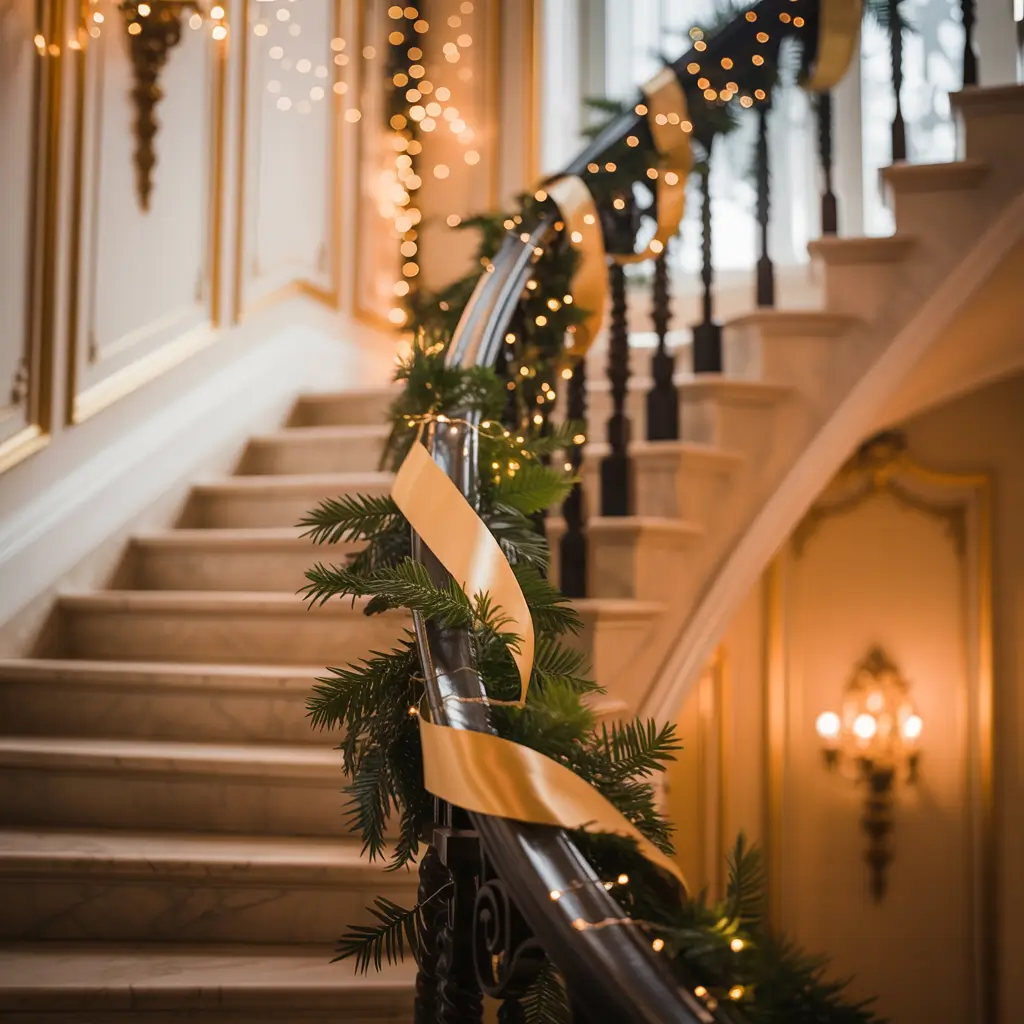Want something that whispers luxury? Golden ribbon lights woven with garland create this upscale, boutique hotel vibe that’ll make your hallway feel like a million bucks.