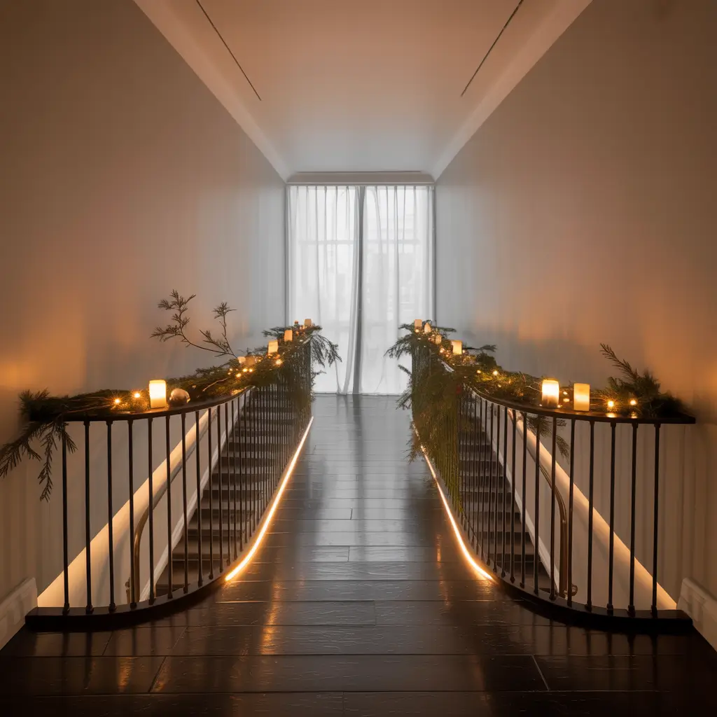 Last but definitely not least, under-railing LED strips create this incredible floating effect that makes your hallway feel like something out of a sci-fi movie—but in a cozy, Christmas way.