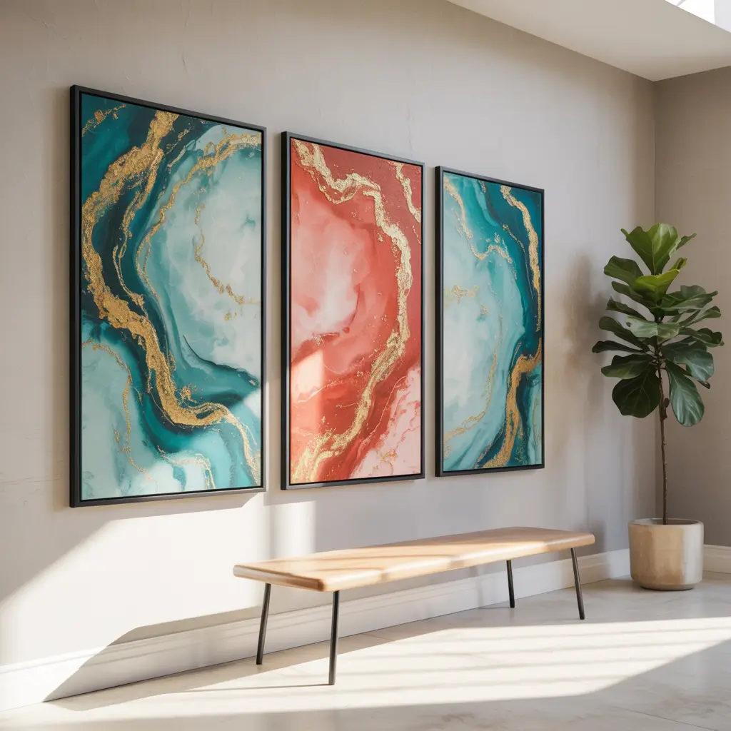 Three coordinating abstract canvases create impact without requiring a huge budget or wall space. The trio format feels intentional and balanced, perfect for hallways where you want art but not overwhelming gallery walls.