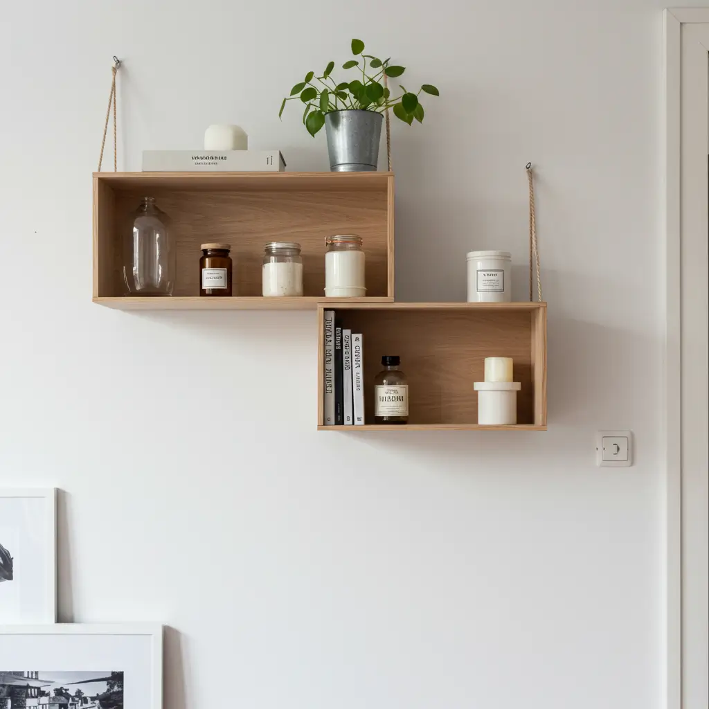 Scandinavian box shelves bring that coveted hygge feeling through clean lines and functional beauty. My white oak boxes create a grid pattern that’s simultaneously organized and organic. The Nordic approach proves that practical doesn’t mean boring.