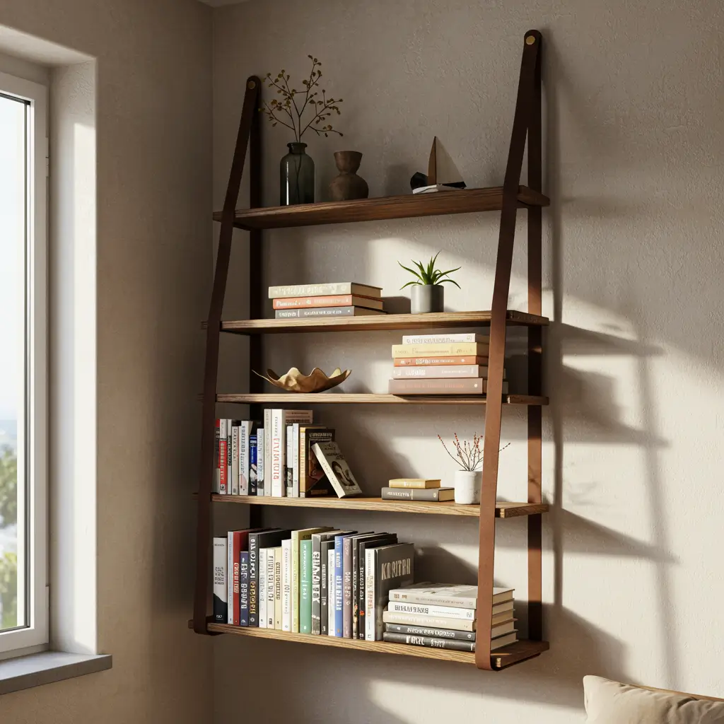 Leather strap bookshelves bring library elegance to modern spaces. My leather-suspended shelves make my book collection look like it belongs in a professor’s study, even though I mostly read beach mysteries. The leather adds warmth and sophistication that rope or chain never could.