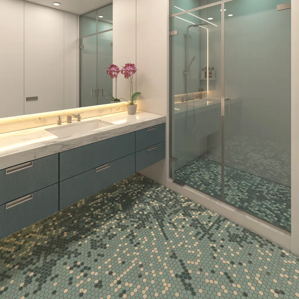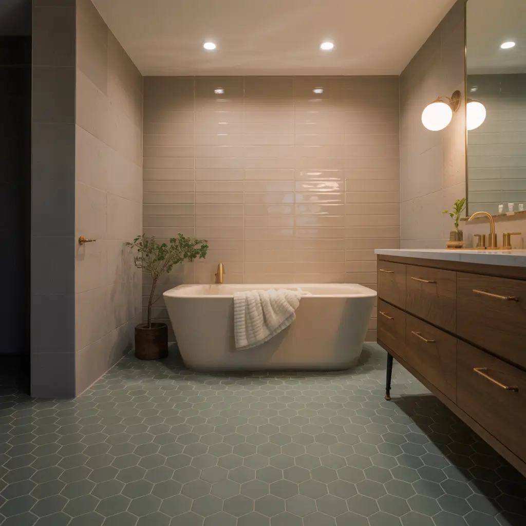I’ve seen this done brilliantly with large hexagons on the floor and tiny hex mosaics in the shower. The shape connection ties everything together, but the size variation prevents that overwhelming honeycomb effect. Another winning combo? Same size hexagons in different finishes – glossy walls and matte floors create subtle contrast.