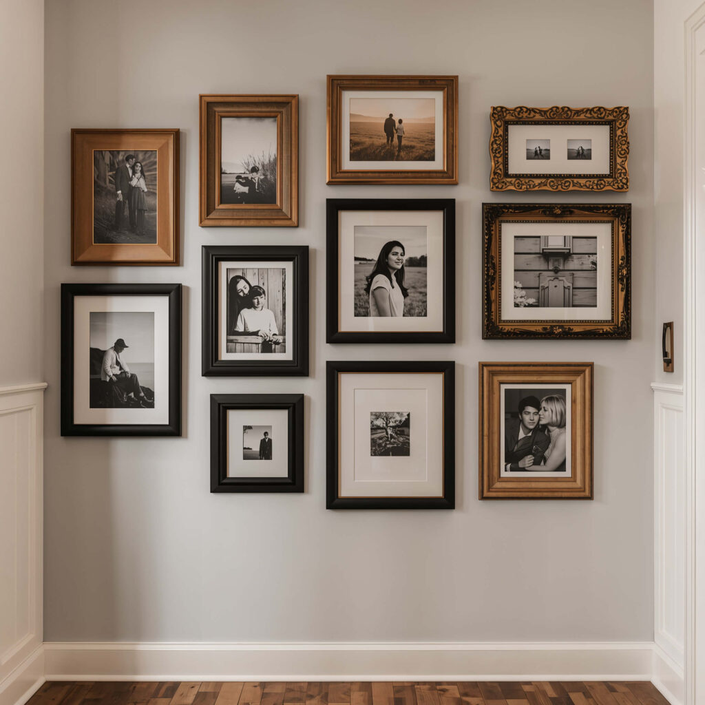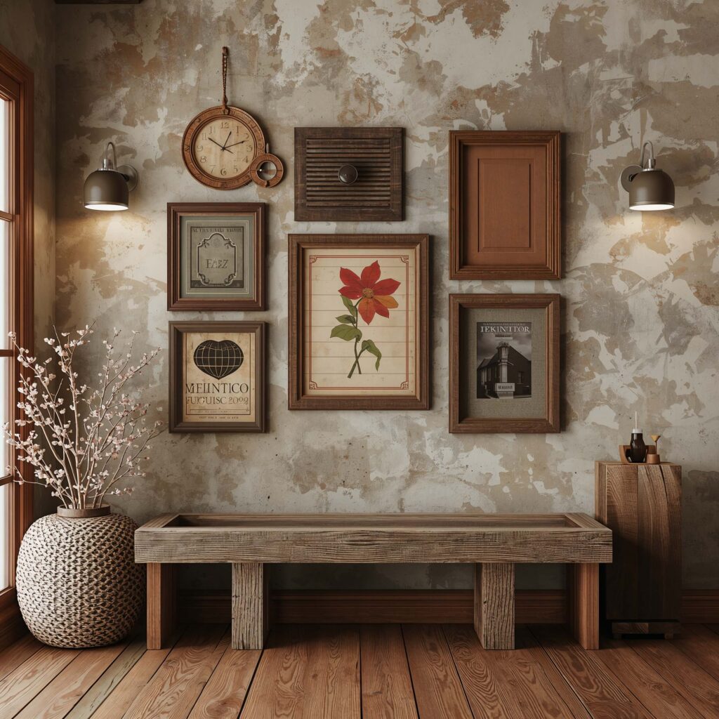 Arrangement matters here. Don’t line everything up perfectly – rustic style embraces imperfection. Overlap frames slightly, vary heights dramatically, and include one or two non-frame elements like a small vintage mirror or antique key hooks.
