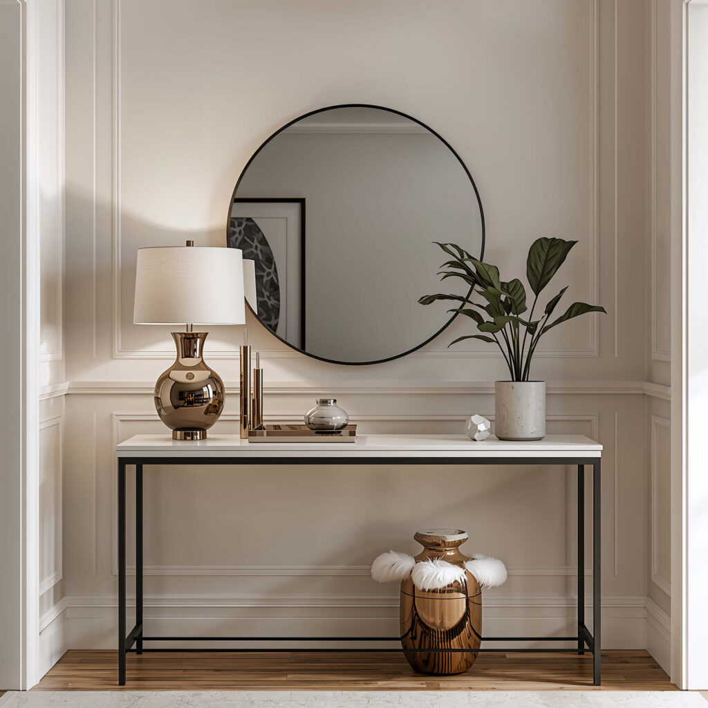 This combo is basically the little black dress of entryway decor – classic, flattering, and always appropriate. A well-placed mirror above a sleek console table creates functionality and style that makes every morning exit smoother.