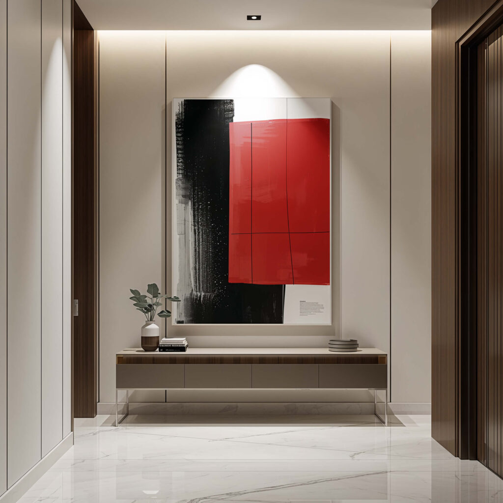 Sometimes you need to go big or go home. A single, oversized art piece can carry an entire entrance wall and honestly? It’s the lowest-maintenance option on this list.