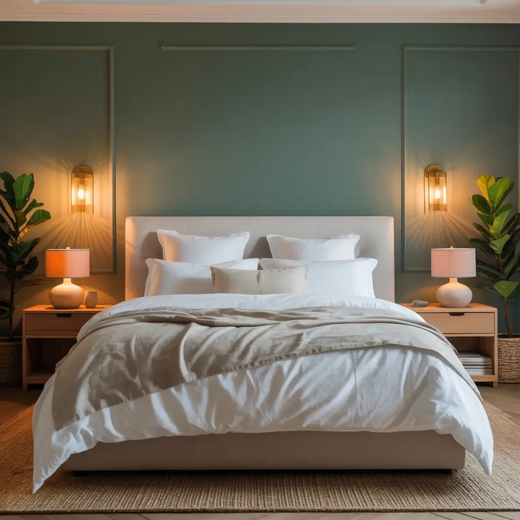 Start with beige as your primary color – walls, major furniture pieces, maybe your rug. Then bring in hunter green through strategic accents: your headboard, curtains, throw pillows, or a statement chair. The beige keeps things light and airy while the green adds depth and interest.