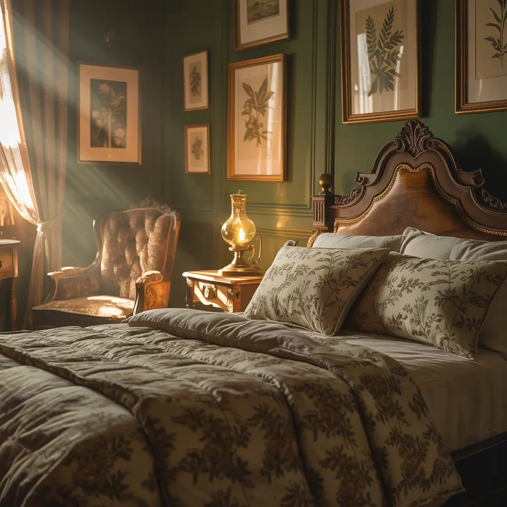 Start with the darkest hunter green you can handle on your walls. Then layer in vintage furniture pieces – an ornate wooden bed frame, a vintage vanity, maybe an antique mirror with a gilded frame. The contrast between the dark walls and detailed furniture creates visual interest that never gets old.