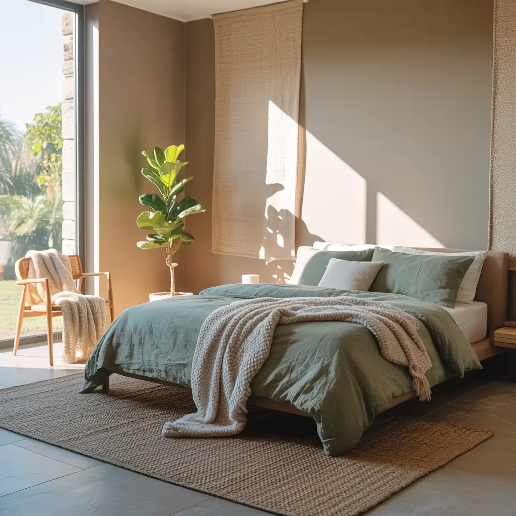 The magic happens in the transition pieces – items that contain both your neutrals and green. A botanical print duvet with green leaves on a cream background, throw pillows that mix both colors, or a rug that incorporates subtle green patterns into a neutral base.