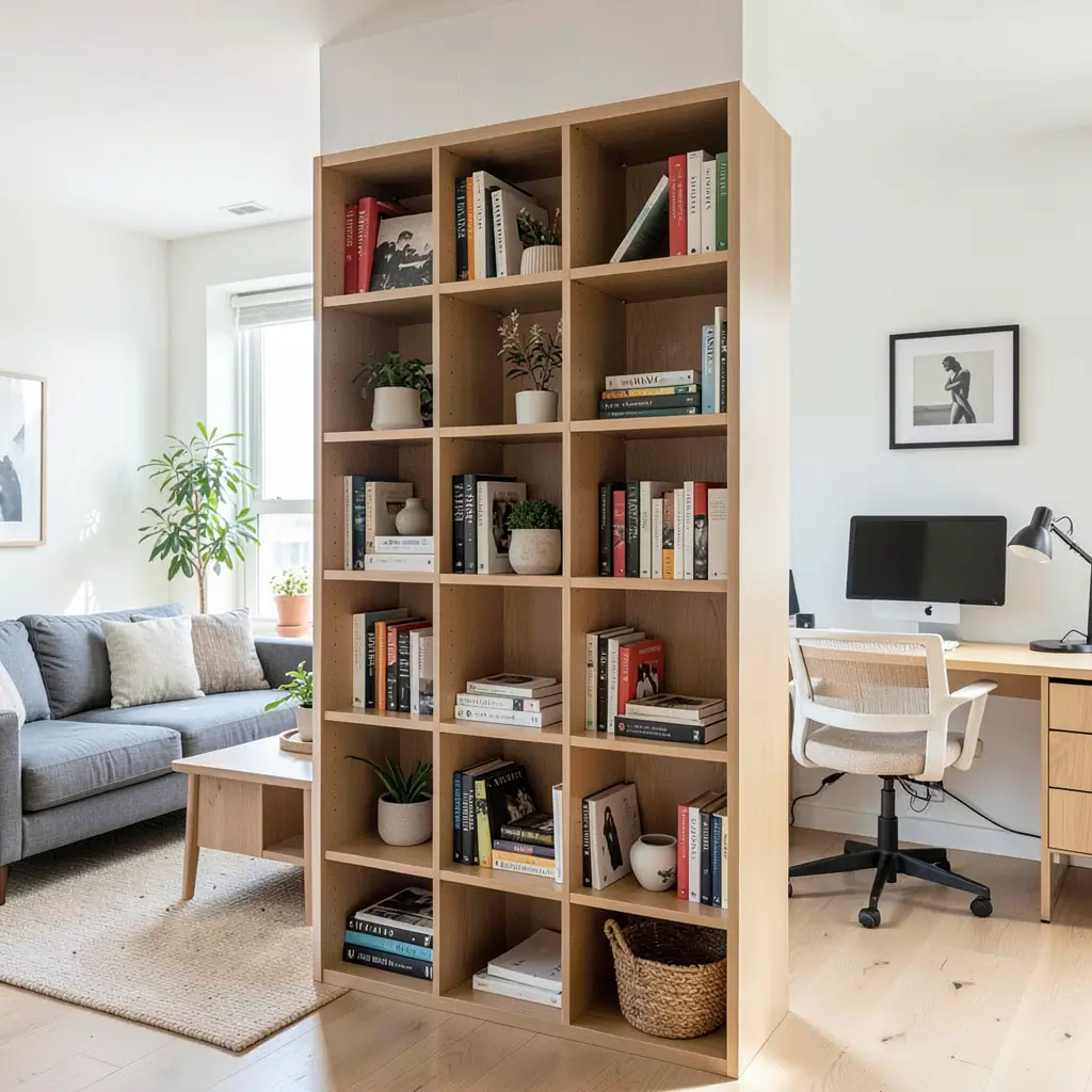 The beauty of bookshelf dividers? They create separation without blocking light or making spaces feel closed off. Plus, you get storage accessible from both sides.