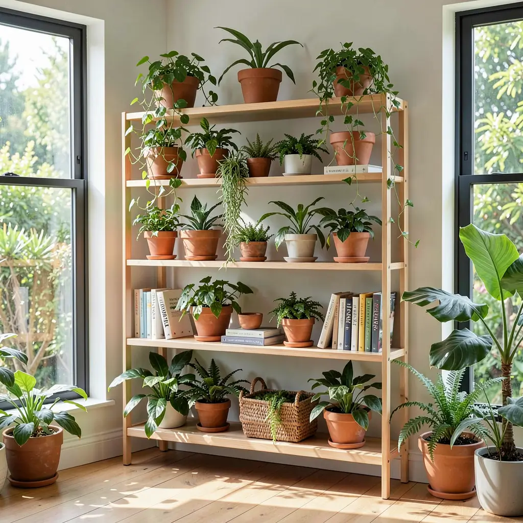 My setup includes trailing pothos on the top shelf cascading down, medium-sized monsteras in the middle, and a collection of succulents at the bottom where my cat can’t reach them (learned that lesson the hard way).