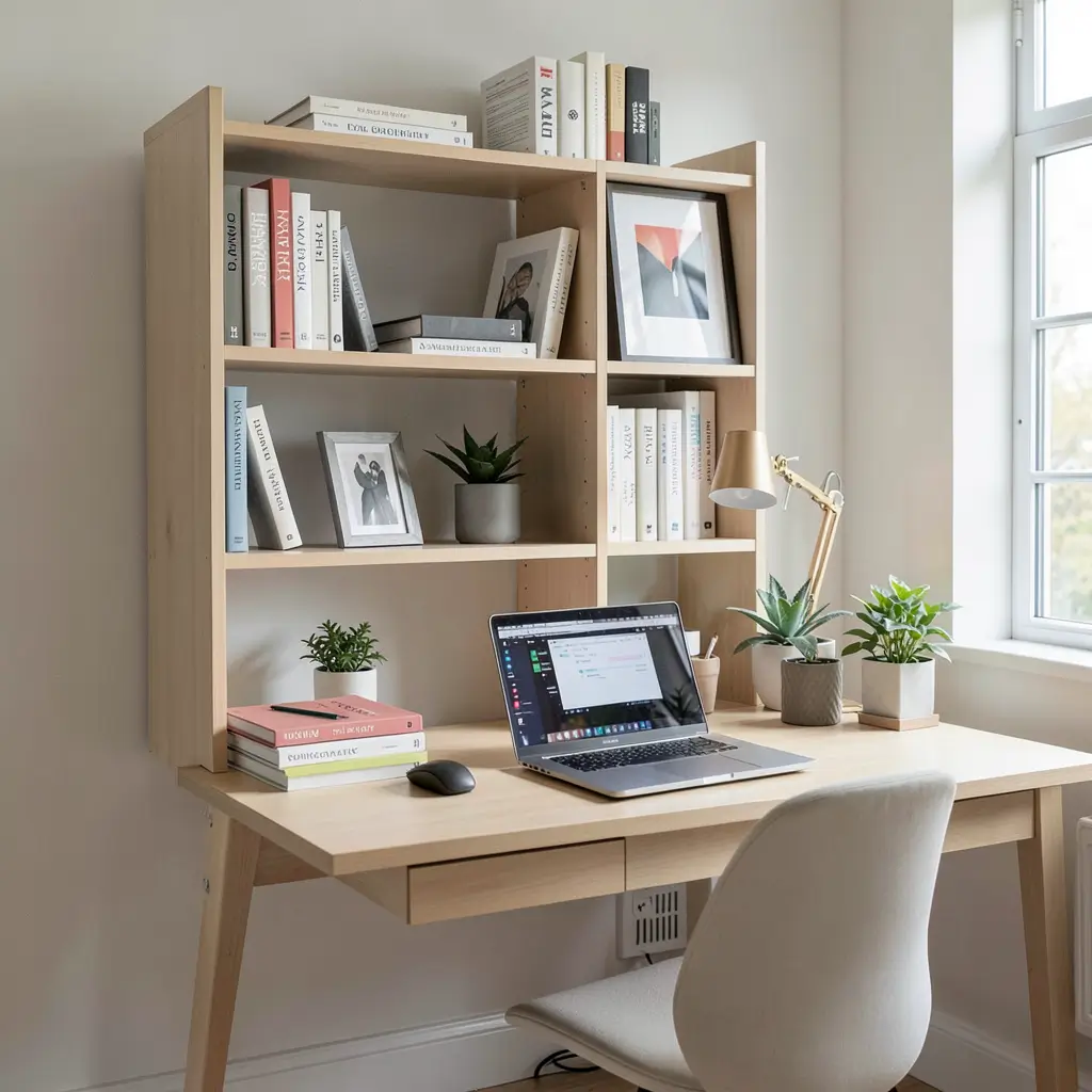 - Top shelf: Reference books and decorative items for video call backgrounds