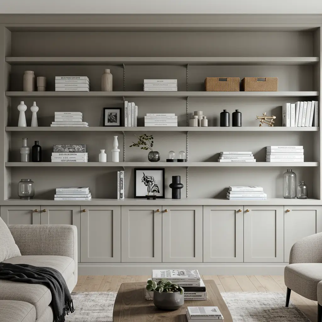 Paint shelves and walls the same color for built-in effect. This technique makes shelves disappear into the wall architecture rather than standing out as furniture. I use the exact same paint color and finish on both surfaces for seamless integration.