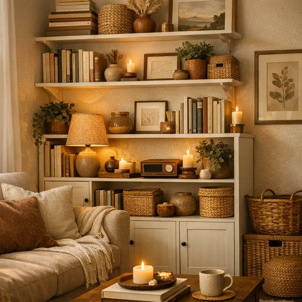 The secret to cozy shelf styling lies in layering textures, warm colors, and personal touches. I mix books with soft textiles, add warm lighting, and include items that tell stories about my life. The goal is making shelves feel lived-in rather than staged.