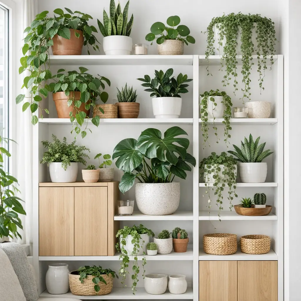 Choose plants based on your shelf’s light conditions, not just aesthetics. I learned this after killing three beautiful but light-hungry plants on my north-facing shelves. Now I match plants to their environment first, style second.
