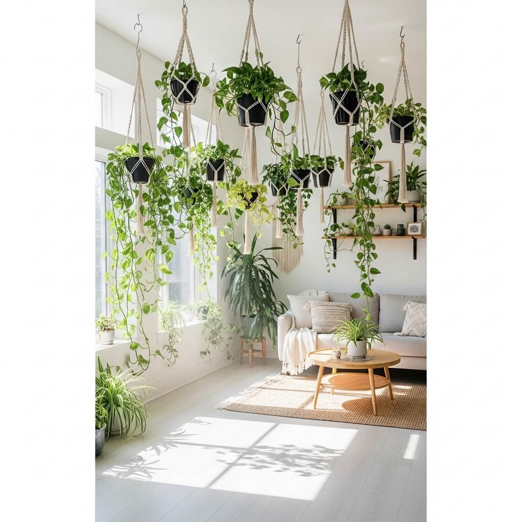 • Hanging planters: Macrame hangers or simple rope systems work beautifully