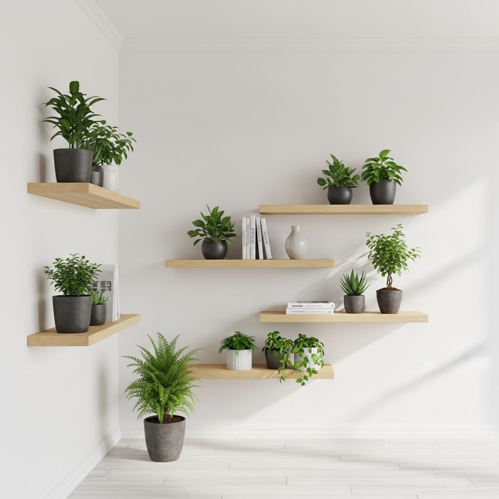 • Wall-mounted shelves: Floating shelves at different heights create depth and interest