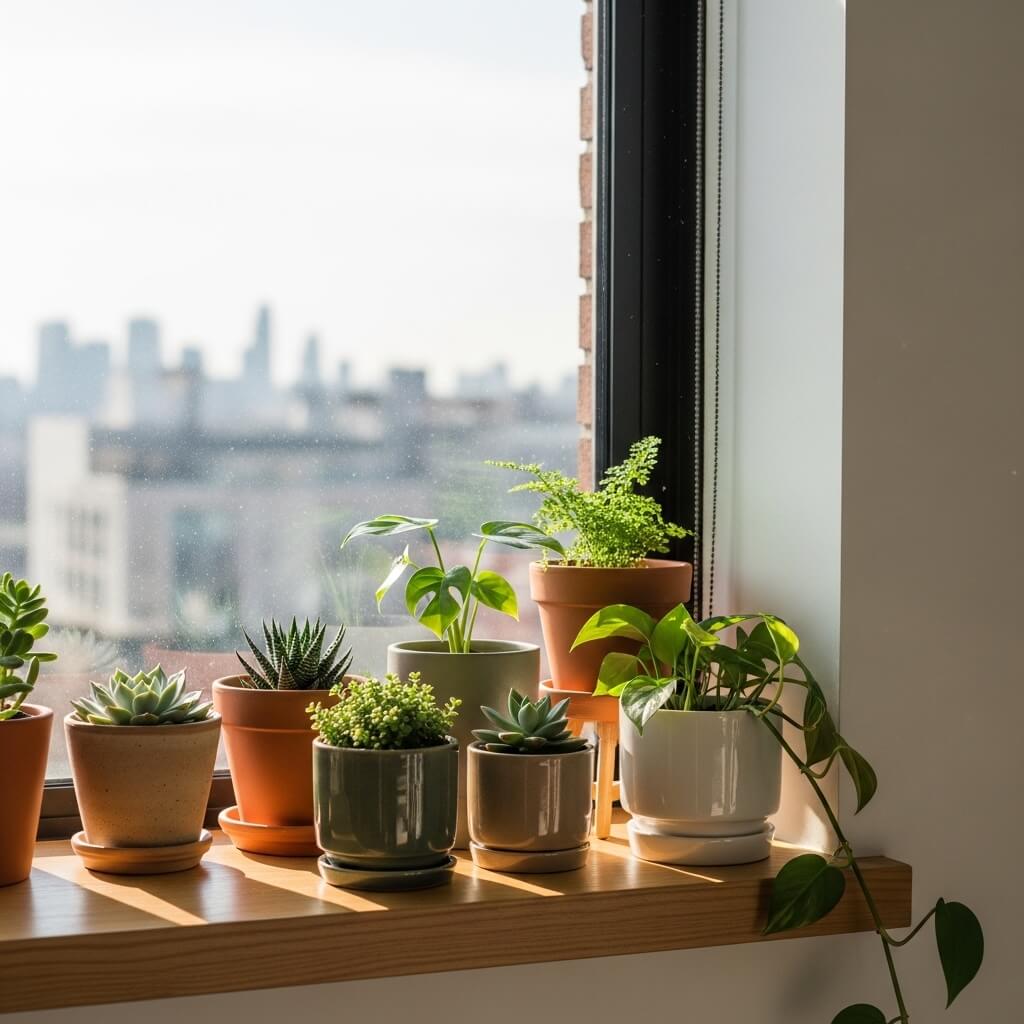 Small herb gardens work beautifully on kitchen window ledges. Living rooms benefit from architectural plants like snake plants or dramatic succulents. Bathroom windows (if you have them) are perfect for humidity-loving plants like ferns or air plants.