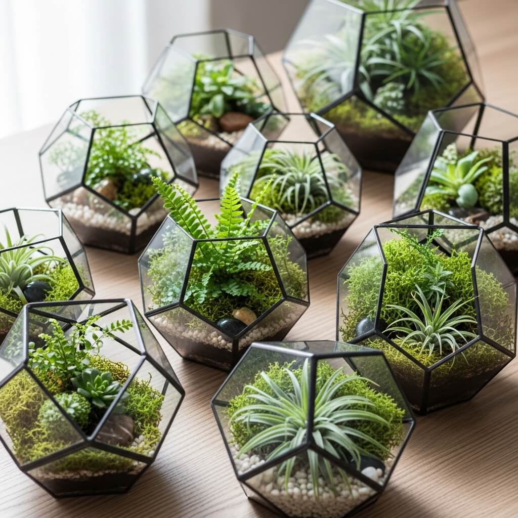 The best part about terrariums? They’re basically self-maintaining once you get them balanced properly. Glass terrariums create their own microclimate, reducing watering needs while providing a stunning focal point.