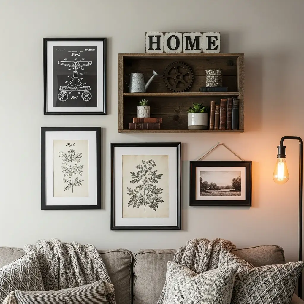 Gallery walls in industrial farmhouse style need more edge than your typical farmhouse collection. Think vintage industrial patents, architectural drawings, black and white factory photography mixed with traditional farmhouse elements like botanical prints or family photos.
