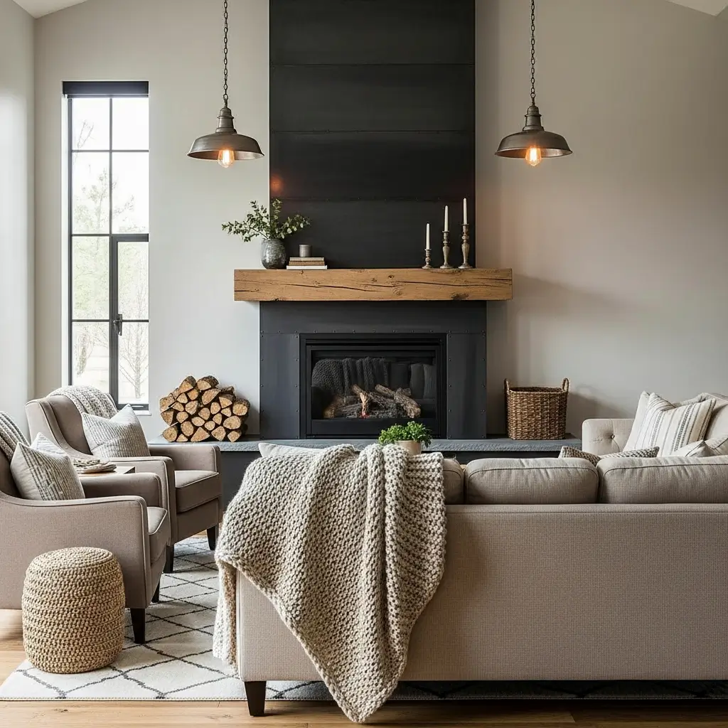 The fireplace becomes your living room’s focal point, and industrial farmhouse style demands something special here. My solution? A sleek black metal insert surrounded by reclaimed barn beams. The contrast between modern and rustic creates exactly the tension this style loves.