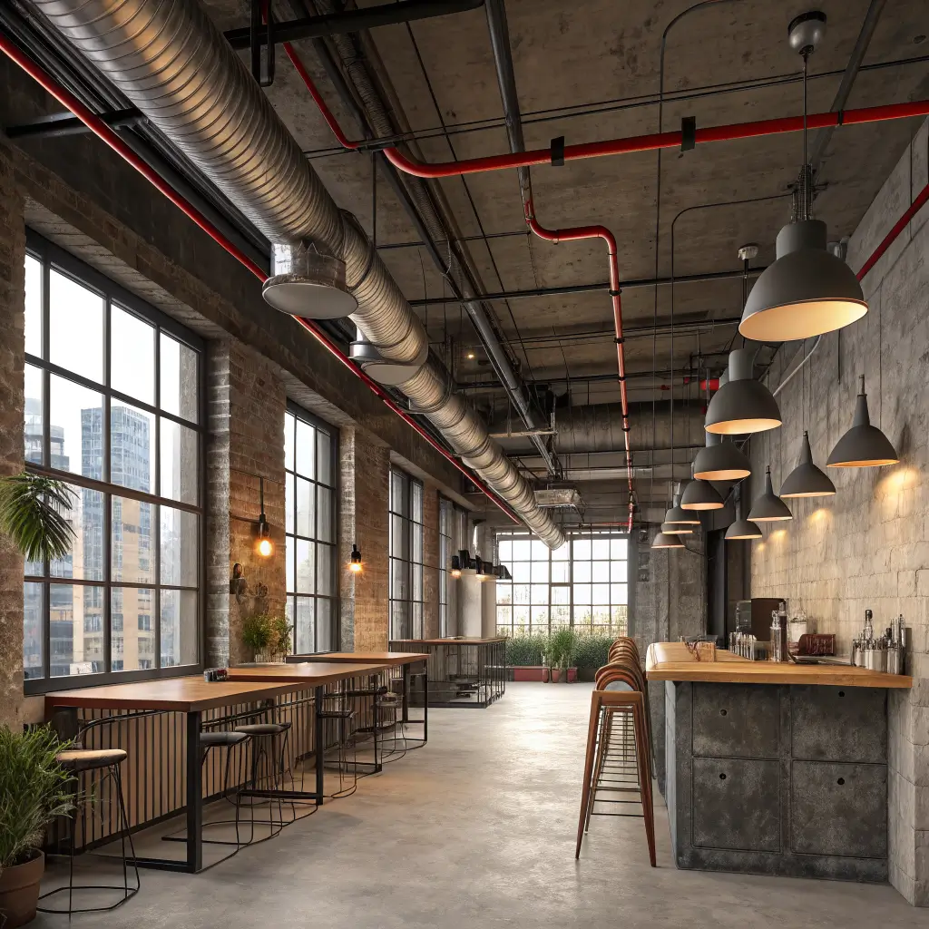 Exposed industrial pipe ceilings celebrate raw functionality as aesthetic feature. Instead of hiding mechanical systems, this approach puts ductwork, pipes, and conduit on display – turning infrastructure into design element.
