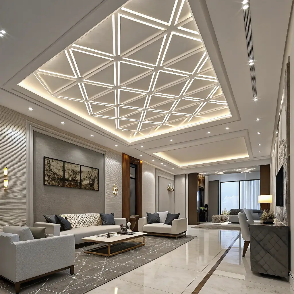 The design possibilities are essentially unlimited. Hexagonal patterns, angular asymmetry, layered rectangles – geometric false ceilings can be subtle or dramatic depending on depth and complexity. One designer friend created a ceiling with cascading geometric panels that literally stops people in their tracks when they enter.