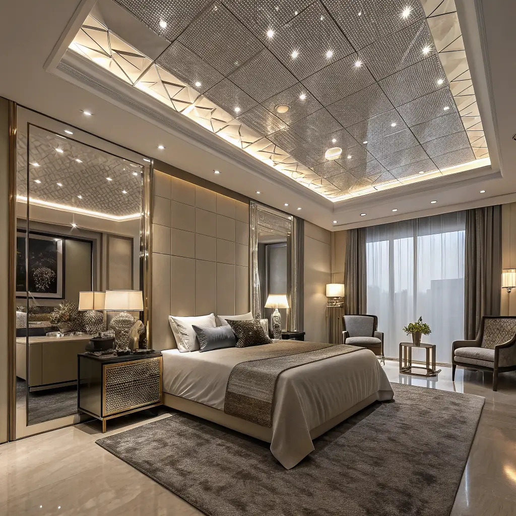 Mirror-inlaid reflective ceilings create instant drama while doubling perceived space. Strategic mirror placement bounces light and creates depth that makes even compact rooms feel expansive.