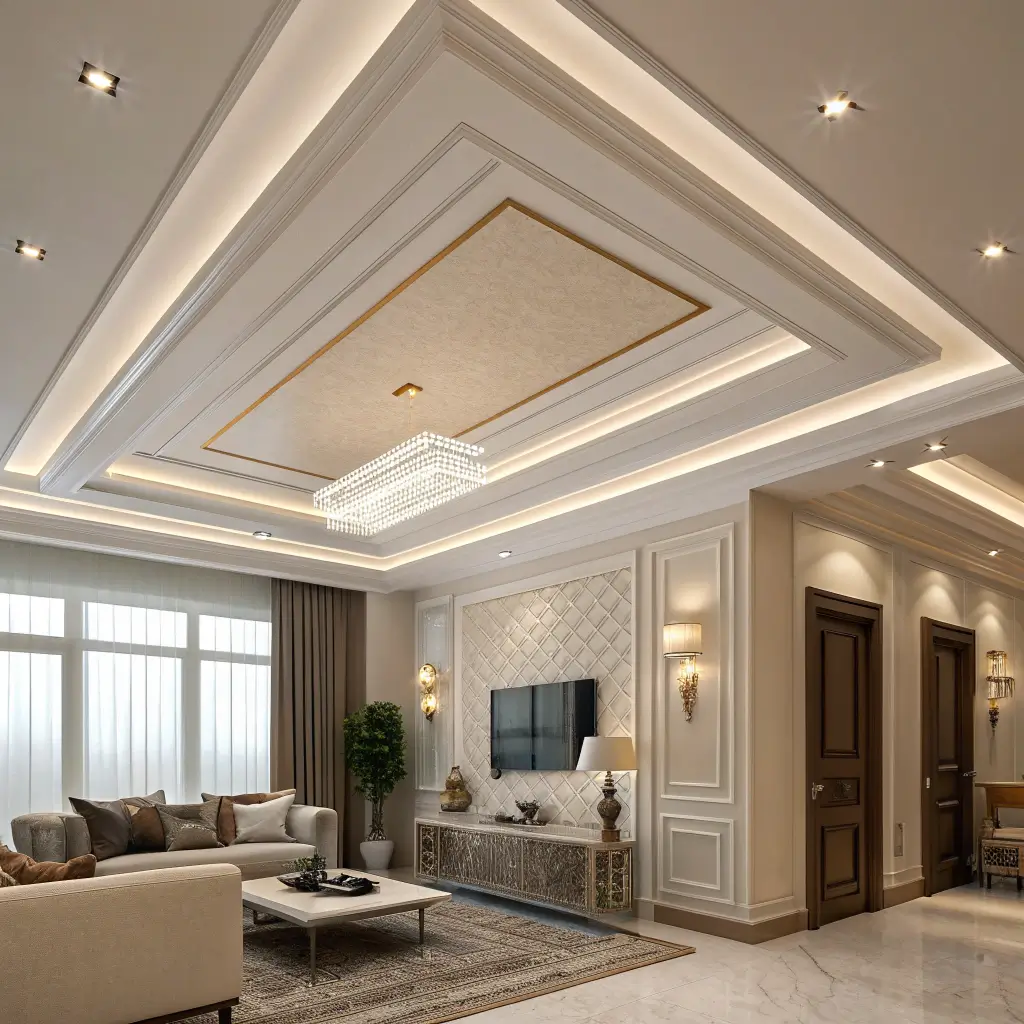 Sometimes the most impactful designs are the simplest ones. A two-tone layered ceiling uses different colors or materials to create depth and visual interest without complex construction.